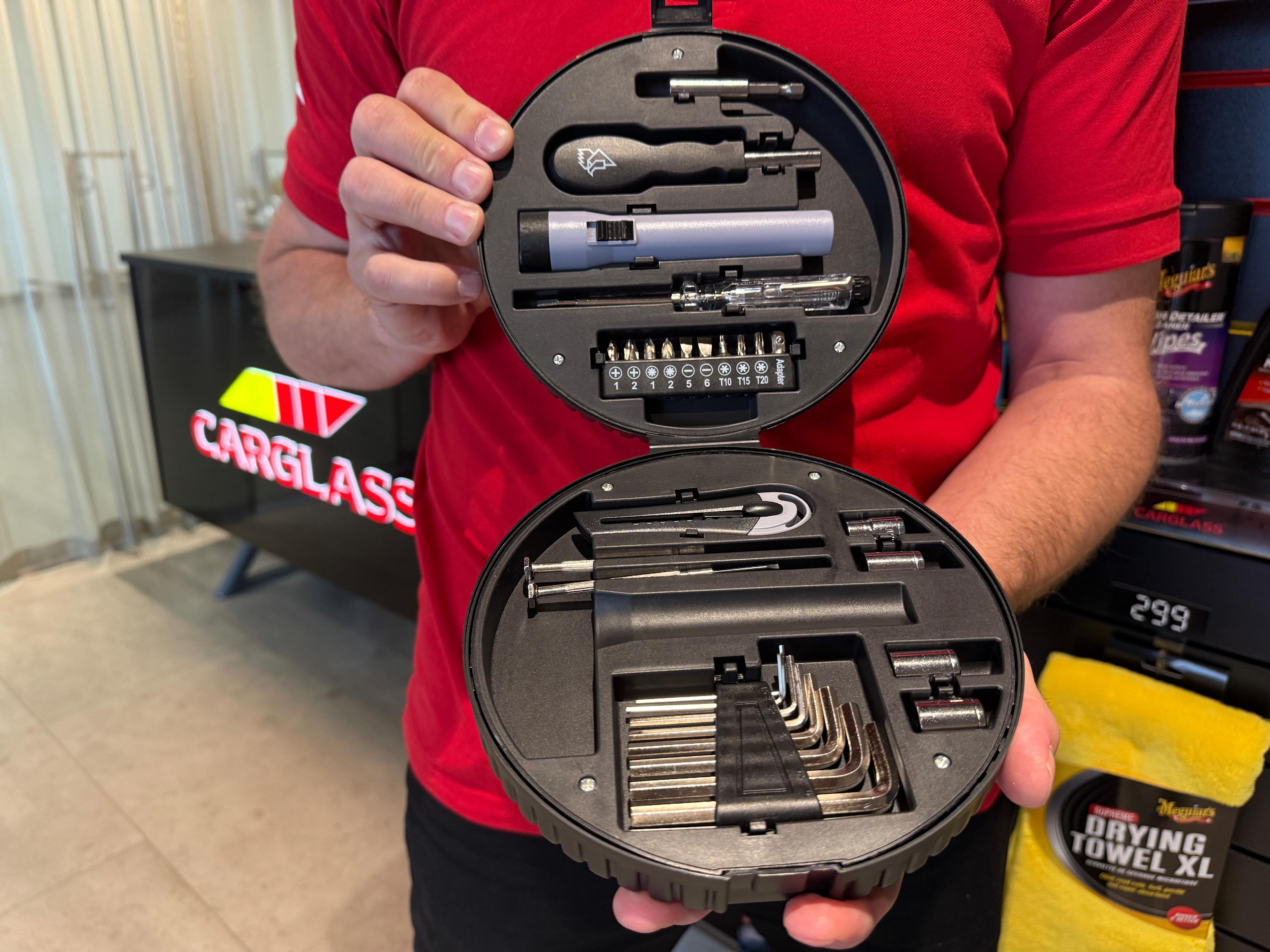 Lige nu får du en gratis toolbox med, når du får repareret stenslag eller skiftet bilrude hos Carglass.